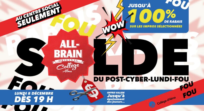Le mercredi était le nouveau jeudi, qui lui-même était en son temps le nouveau vendredi. Au Collège, on fait plus fort encore en te servant le gros fun en plein lundi soir! Marque une petite pause en cette fin de session et viens te divertir au centre so avec les All-Brain. Une pause mentale, c’est bon pour la charge mentale et tu n’en auras que le cerveau plus frais et dispo!
