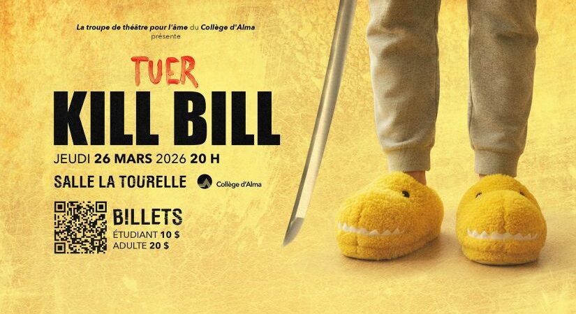 Tuer Kill Bill est un projet collaboratif qui mêle la Troupe de théâtre de l’Âme du Collège d’Alma et des étudiants du programme de Technologies sonores. Cette courte pièce, qui se veut un hommage au film de Tarantino, s’interroge sur la violence, la vengeance et la difficulté de vivre ensemble dans un monde où il est de moins en moins mal vu de se donner des taloches. Ce spectacle prend la forme d’une lecture actée, avec en plus ben des effets sonores.